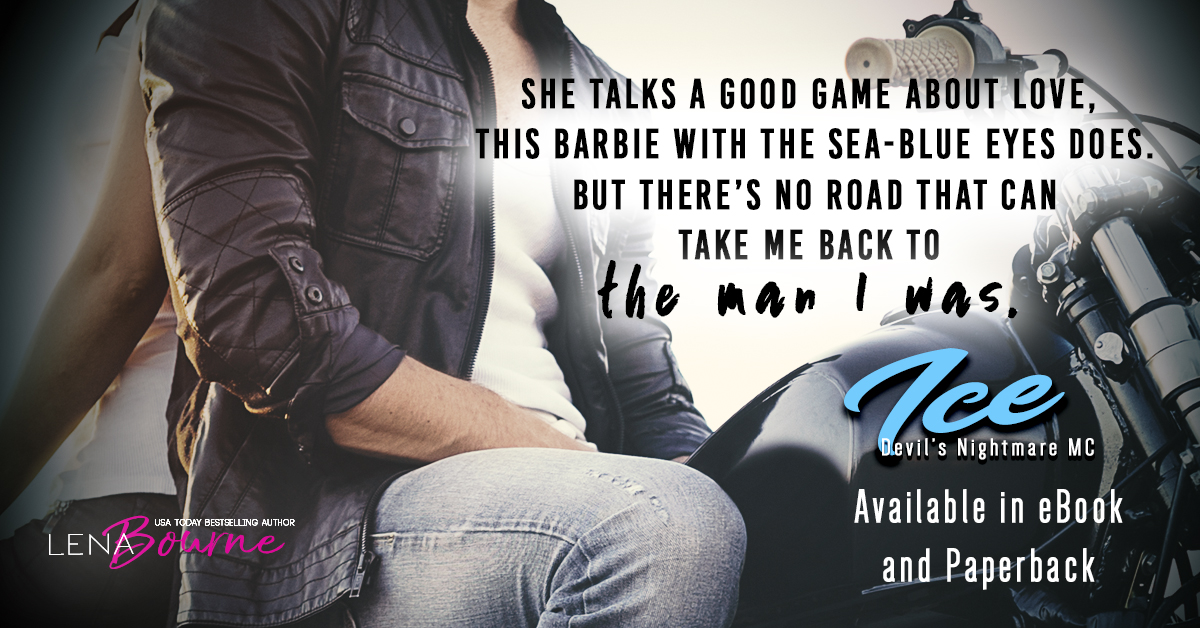 ICE is the fifth book in the bestselling Devil’s Nightmare MC series by Lena Bourne. It is a standalone story with a guaranteed HEA ending, no cliffhanger, and no cheating!