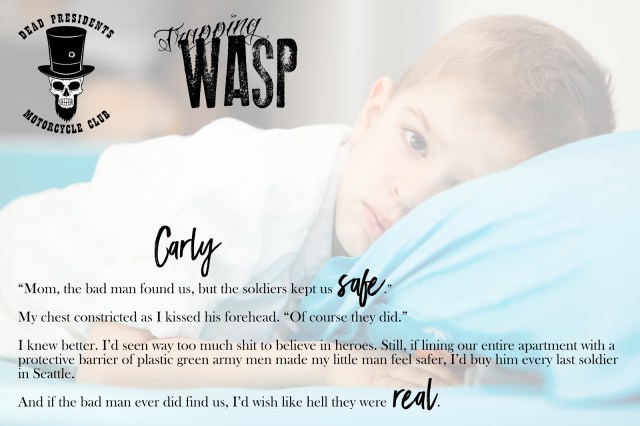 Carly Cooper is a survivor. When an old friend turns from protective to possessive she packs up her five-year-old son and flees to Seattle, leaving everything and everyone she knows behind. Carly has neither time nor energy for Wasp’s advances, despite his panty-dropping smile and made-for-sin body.